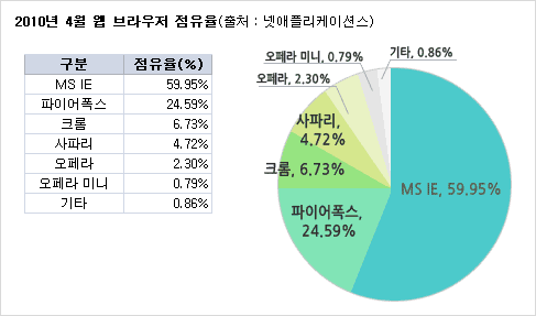 MS 인터넷 익스플로러의 미국 시장 점유율이 60% 아래로 떨어졌다 . 파이어폭스와 크롬 등다른 웹브라우저가 경쟁력을 강화하고 점유율을 조금씩 늘리고 있다 . 시장조사기관 넷애플리케이션에 따르면 미국 시장점유율은 59.95% 로 , 지난해보다 8% 정도 떨어진 수준이다 .