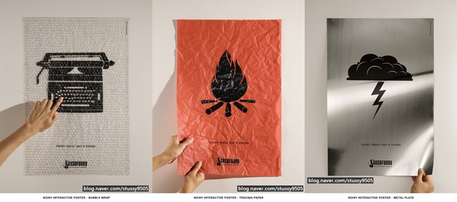 매체는 포스터인데 3개의 포스터마다 특징이 있다. 종이 제질에 따라서 그종이의 질감과 느낌을 소비자들이 직접 느끼게 하기 위해서 포스터를 만질 때마다 소리가 나게 제작하였다.