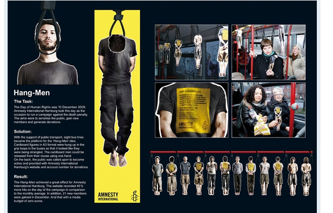 버스 손잡이를 사형대로 만들어서 목이 떯어져 나간 사형수들을 나타내었다. 다소 잔인해 보이지만 시민들에겐 놀라움과 생명의 소중함을 잘 전달해준 좋은 예시라고 판단이 된다.(버스에서 내린 후에도 오래도록 기억에 남을 것이다.)