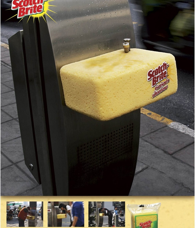 외국의 주방세제회사인 Scotch-Brite에서 일반 시민을 대상으로 위의 프로모션을 기획하였다. 식수대에 실제 제품을 부착시켜서 물이 스며들게 하는 효과를 직접적으로 체험하게 만들어 제품이 가진 특성과 장점을 그대로 전달해준 좋은 예이다.