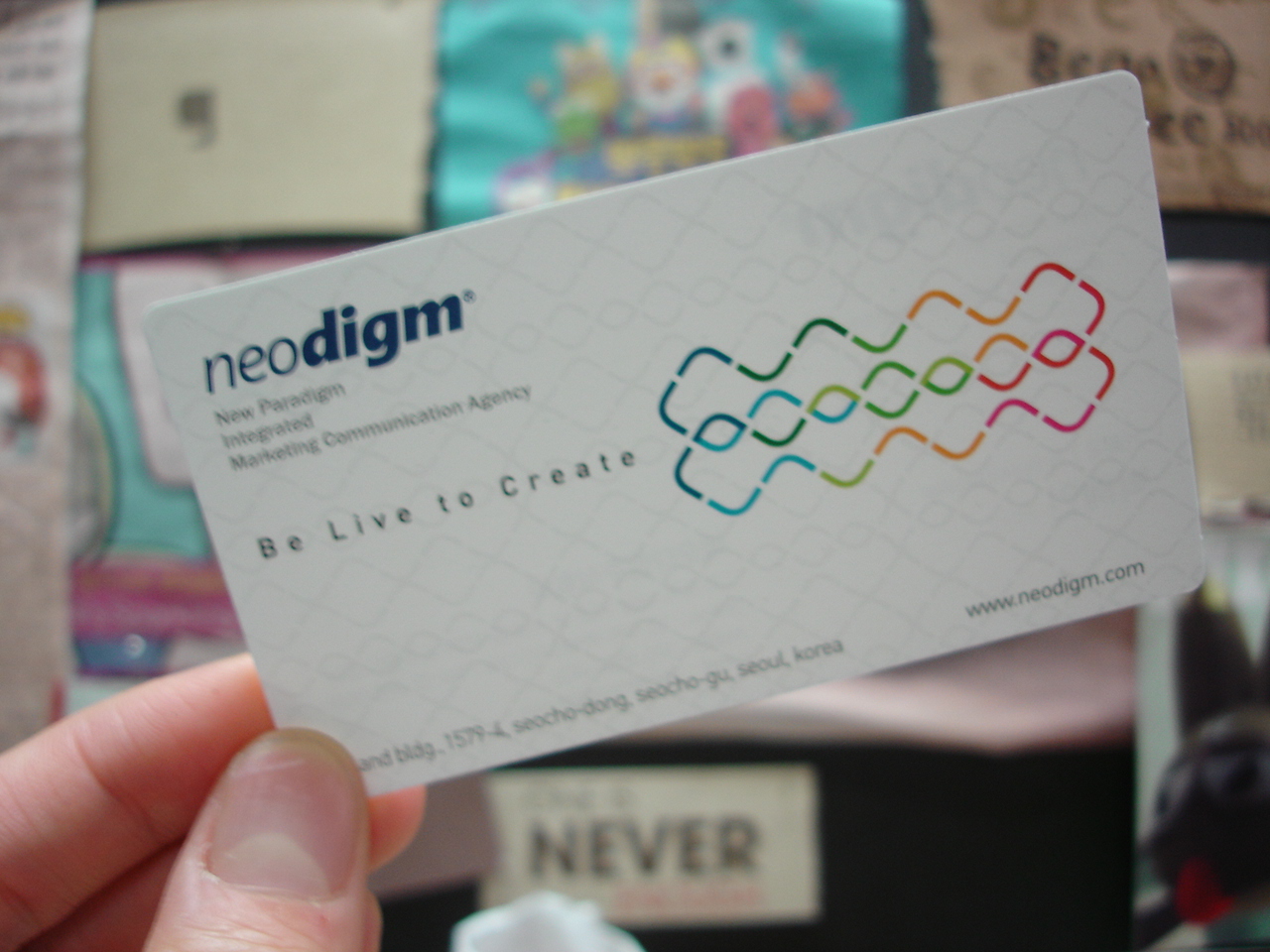네오다임 명함을 소지하고 계신 당신, 혹시 네오다임의 명함을 유심히 살펴보신 적이 있습니까? 볼록 튀어나온 무지개 빛의 크리에이티브 유전자만 두어번 만져보기만 하지는 않으셨는지요. 저는 이번 칼럼에 네오다임 명함 한 귀퉁이의 작은 무언가에 대해 몇 자 적어보려 합니다. 관심을 가지고 명함을 유심히 들여다보고서야 보였던 문구. 이 자그마한 글씨들이 어쩌면 네오다임의 지향점이 아닐까하는 생각이 들어서입니다. 입사한 지 1년도 채 안된 신입사원이 감히 네오다임에 대해 논하려고 하나 생각하실 분이 계실까봐 대단히 송구스러우나, 오히려 네오다임을 거의 모르는 제가 짧은 지식을 더해 '네오다임'을 나만의 방식으로 이해하고 싶은 작은 바람에서 쓰는 글이오니 오해는 없으시길 바랍니다 :)