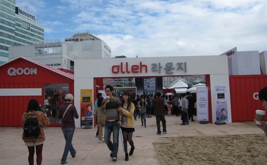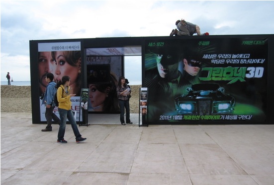 모래사장에서는 부산 국제 영화제를 통해 마케팅을 하려는 기업의 행사부스가 즐비해있었다.