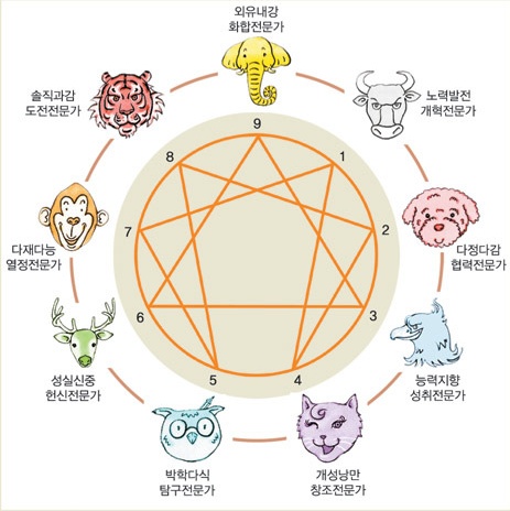 에니어그램은 에니어(9)라는 단어와 그램(도형)이라는 단어가 만나서 만들어진 합성어입니다. 즉, 에니어그램은 그리스어로 '아홉개의 점이 있는 도형'이라는 뜻 입니다. 뜻을 보면 알 수 있듯이 에니어그램은 사람의 유형이 9개로 구분된다고 보는 성격분석 이론입니다.