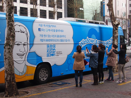 단순히 움직이는 홍보 매체가 아닌, 소비자들이 자발적으로 움직일 수 있는 Something이 필요했다. Impact있는 버스 랩핑 디자인을 물론, 쉽고 간편한 이벤트 그리고 홍보 효과를 가시적으로 보여줄 수 있는 방안으로 Windows 8 개발자 버스 사진 이벤트를 진행하였다.