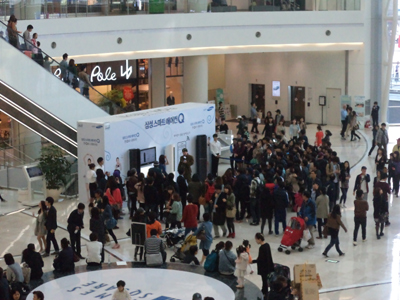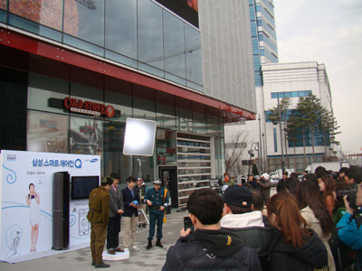 ![]() ![]() ![]() ![]() 여러 차례의 제안과 협의를 통해 점차 현실적인 실행 안으로 재편집되고 에어컨을 밴딩머신과 같은 기능으로 제작하게 되었다. 이는 사람이 에어컨 뒤 부스에 들어가 있고 실제 밴딩머신과 같은 기능을 하는 제작된 에어컨 앞에 다른 사람이 위치하여 운전-냉방-에어컨이라는 세 가지 명령어로 에어컨을 온/오프할 수 있다는 것을 연출하는 것으로, 이구동성게임과 함께 운영되었다. 그리고 에어컨 뒤 부스안의 보이지 않는 사람이 에어컨 하단 부분을 오픈하여 참여대상 별로 구성된 기념품을 증정하게 되고 참여한 사람들은 뜻밖의 위치에서 개방된 후 사람이 전해주는 선물을 받고 놀라게 된다. 이러한 운영방안은 제품에 대한 참여자의 이해를 높이는데 효과적이었다. 제품의 특성을 살릴 수 있는 마케팅 Tool과 게임운영방식이 소비자에게 삼성스마트에어컨Q라는 브랜드와 더불어 스마트한 ‘음성인식기능’을 자연스럽게 연결시켜주어 참여하는 재미와 동시에 제품에 대한 이해도를 높일 수 있었다.