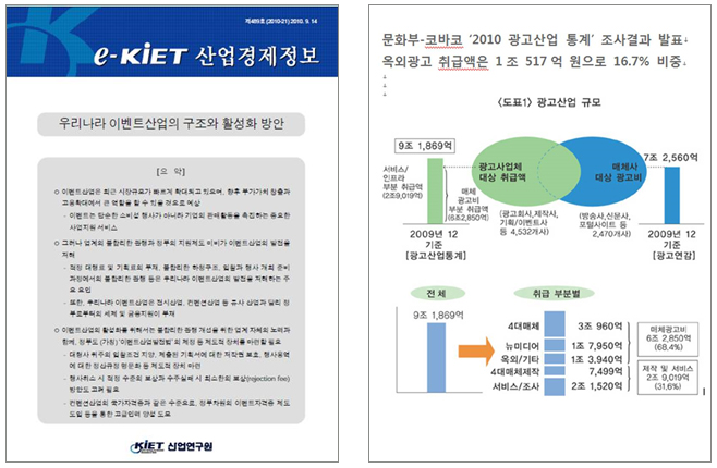 “국내 이벤트 전문업체의 수는 정확히 파악되진 않으나 2009년 제1회 이벤트 산업 전 DB구축 시 약 3,000여 개의 기업이 등록되었고, 이 중 연 매출 100억 이상인 기업은 10개 이하이며, 대다수 업체들의 규모는 영세하다. 국내 이벤트 산업 규모는 1조6,000억~2조원에 달하는 것으로 추정된다. 민간기업의 총 광고비는 2008년 기준으로 약 9조 3,116억 원이며, 이 중 10~15%인 9,000억~1조 3,000억원 정도가 기업의 이벤트 관련 추산되고, 지자체 행사 및 축제 경비는 2007년 결산 기준으로 7,277억원 이다. 이벤트 산업은 BTL광고의 일부이지만, 대부분의 BTL광고가 이벤트와 밀접하게 연결되어 있다. 국내 이벤트 산업은 향후에도 BTL의 중요성이 점차 높아지는 추세와 함께 높은 성장세를 지속할 것으로 예상된다.”(KIET, 산업연구원, 산업경제정보, 제489호(2010~21)2010.9.14, 4page)