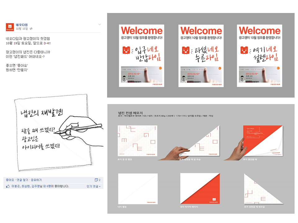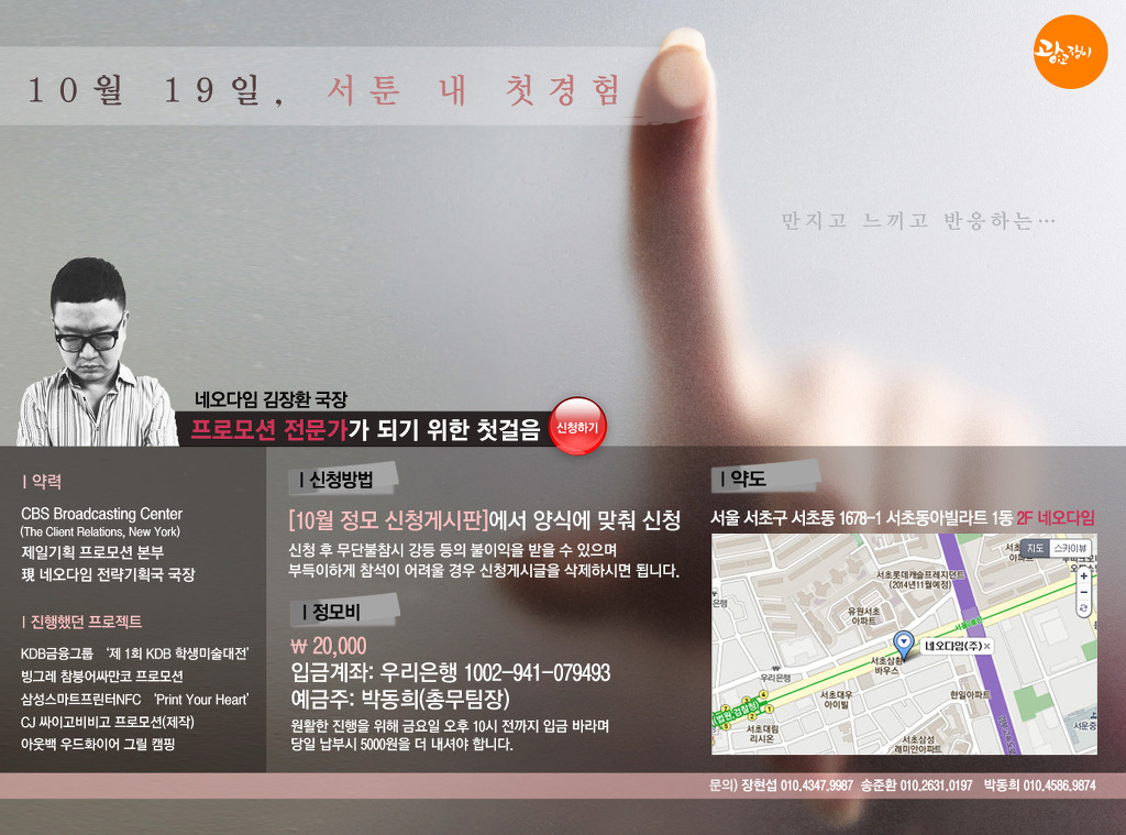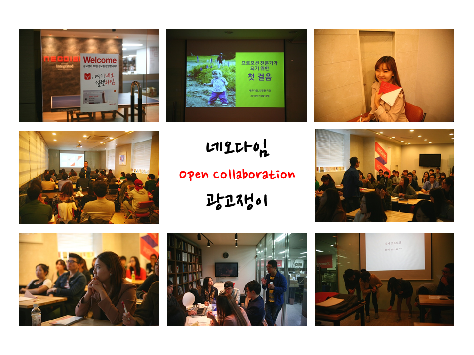 이런 '광고쟁이'에 네오다임을 대표해서 선제안했다. 그 동안 경험하지 못한 BTL 분야의 정보를 광고에 관심 많은 '광고쟁이' 회원들에게 전하도록 강의와 장소 모두 준비하겠다고 제안했다. '광고쟁이' 역시 새로운 시도에 흔쾌히 동의했다. 이미 대표님과 실장님의 적극 지원을 약속 받았기 때문에 강의는 네오다임 베테랑 스피커 김장환 국장님이 진행해 주시기로 했다. 그렇게 네오다임의 '오픈 콜라보레이션'은 '광고쟁이'가 만든 홍보 포스터 공지를 시작으로 첫걸음을 뗐다.