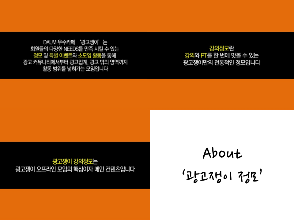 no전공, no지식, no인맥이었던 대학생 시절, 모든 광고 정보는 Daum카페 '광고쟁이'로 통했다. 절박함에서 비롯된 용기였을까? 무작정 가입 후 꾸준히 정모에 참여하니 운영진도 했고 인턴의 기회도 생겼고 어느새 자연스레 광고 쪽 일을 하고 있다. 15년의 역사와 45,533명의 회원을 자랑하는 '광고쟁이' 역시 온라인 모임 답지 않은 탄탄한 정모 프로그램 운영으로 성장했다.