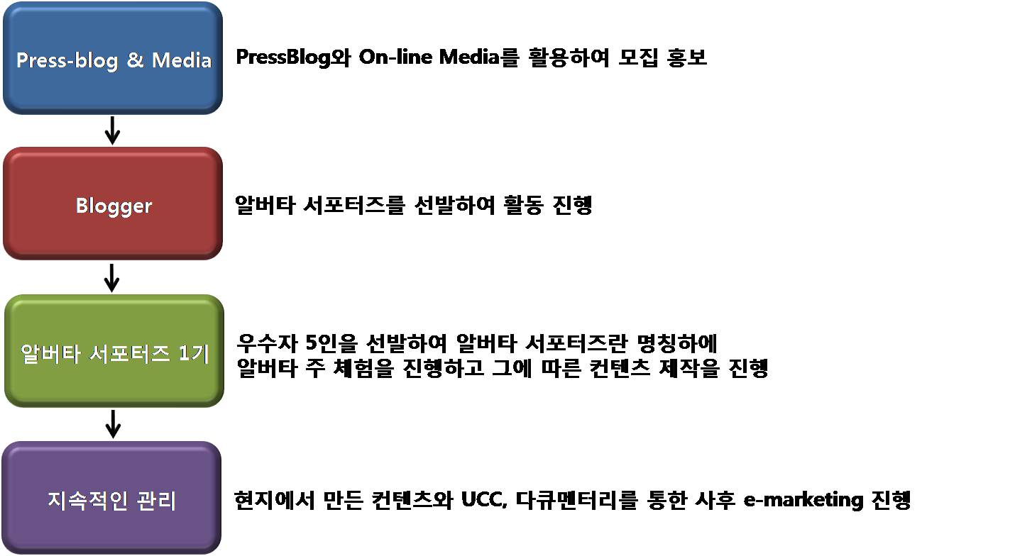 일정 수준 이상의 블로거를 모집하기 위해 국내 최대의 블로거 관리 업체인 프레스블로그와의 공동 모집을 진행하였고, 그 결과 그들이 가지고 있는 블로거 DB를 활용하여 다수의 블로그에 글을 게시하였고, 많은 수의 블로거 지원자를 확보할 수 있었습니다.