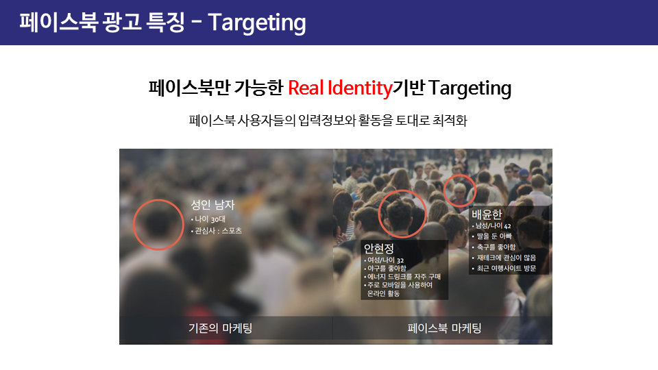 페이스북은 기본적으로 로그인 기반의 서비스이기 때문에 이메일과 전화번호를 필수로 입력한다. 또한 페이스북 내에서 친구를 찾기 위해 이름, 성별, 생일 등의 많은 개인 정보를 입력하게 된다. 이처럼 실제 사용자 정보(Real Identity)기반이기 때문에 페이스북은 사용자가 누구인지 정확히 알고 있고 이를 통해 클라이언트가 원하는 조건에 맞춰 필요한 고객들을 어느 매체보다 정교하게 타게팅 가능하다. 다르게 이야기하면 페르소나 기반의 타게팅을 통해 인지/고려/전환/충성도 단계에 맞춰 관련성 높은 메시지를 전달 가능하다. 이처럼 보다 정교한 타게팅이 가능해짐으로써 기존의 광고에 비해 동일한 비용으로도 가망고객 도달율이 높아지고, 타게팅 효율이 높아짐으로써 CTA에 반응도 높아진다. 따라서 이전에는 시도해보지 못했던 다양한 마케팅 활동을 시도해 볼 수 있다.