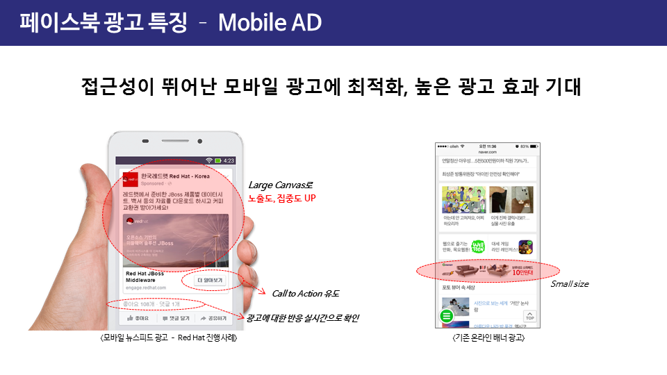 대한민국 전체 인구의 29%, 약 1,400만 명이 매달 페이스북을 사용하고 있다. 전체 인구 중 0~13세 미만의 아동들과 65세 이상의 노인을 제외한다면 실제로 경제 활동 중인 인구의 반 이상이 페이스북을 사용하고 있는 셈이다. 이들 중 93%의 사용자가 매일 모바일로 페이스북을 사용하고 있다. 페이스북 광고 역시 모바일에 최적화되어 접근성이 좋고 집중도가 높다. 또한 배너 스타일의 광고가 아닌 기존 포스팅과 유사하게 전체 화면을 꽉 채워 타임라인에 노출됨으로써 사용자들의 거부감이 적기 때문에 광고에 반응할 확률 역시 높다.