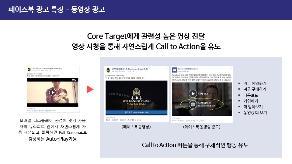 페이스북 동영상 광고 역시 정교한 타게팅을 통해 원하는 고객에게 생동감 있는 메시지를 전달한다. 영상을 본 고객의 친구에게 자연스럽게 노출도 가능하기 때문에 동영상의 확산과 바이럴 효과를 기대할 수 있다. 게다가 영상을 시청 후 해당 웹페이지로 유도하거나 다른 영상을 보는 등 CTA을 지정할 수 있어 고객의 반응을 유도하기 효과적이다.